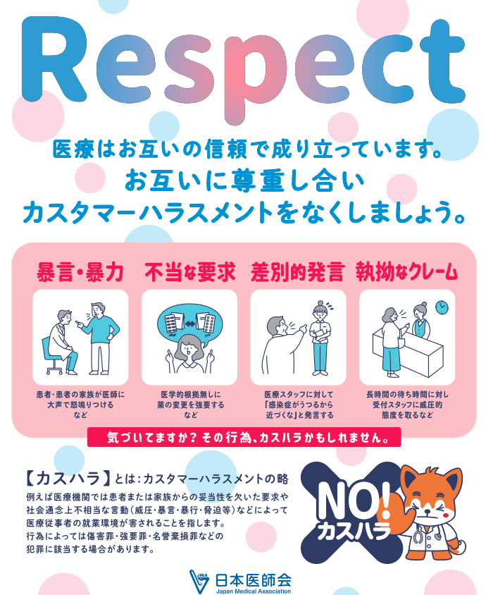 ・新興感染症(感染症のうち、以前は知られていなかった感染症を「新興感染症」と呼びます)の発生に備え、患者様が待合室で密にならないようお願い申し上げます。付き添いの方はお一人様に限らせて頂きます。咳や発熱、喉が痛いなどの症状が数日前から続いており、当院受診を希望される方は、事前に電話でご相談をしてくださるようにお願いしています。